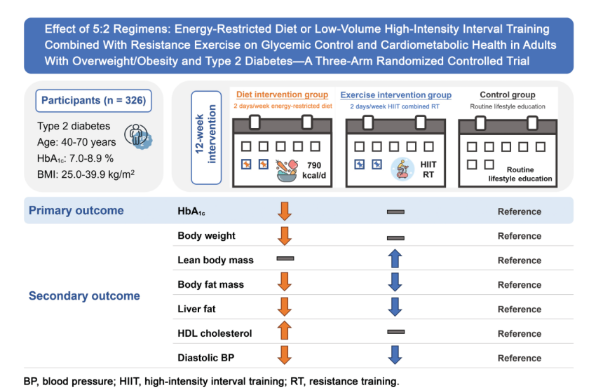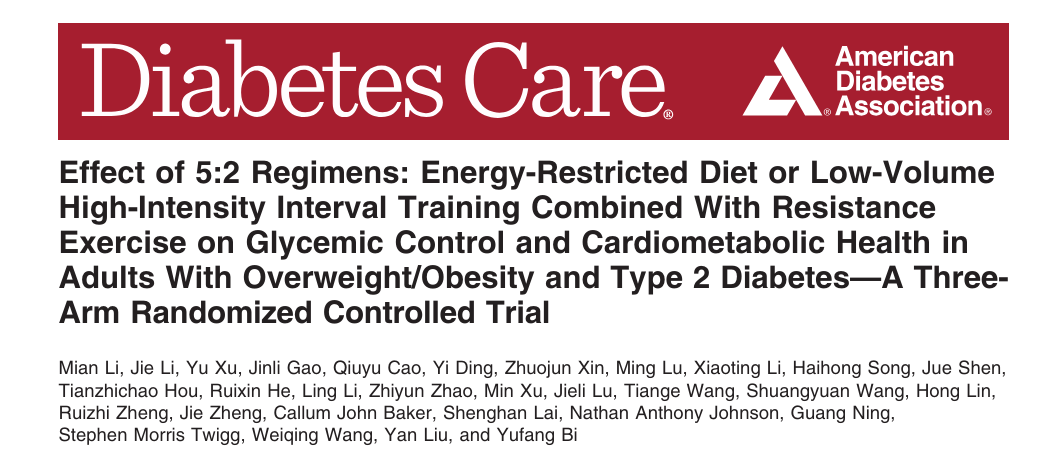 [1] Li M, Li J, Xu Y, et al. Effect of 5:2 Regimens: Energy-Restricted Diet or Low-Volume High-Intensity Interval Training Combined With Resistance Exercise on Glycemic Control and Cardiometabolic Health in Adults With Overweight/Obesity and Type 2 Diabetes-A Three-Arm Randomized Controlled Trial. Diabetes Care. Published online April 18, 2024.