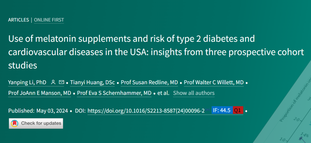 [2] Li Y, Huang T, Redline S, et al. Use of melatonin supplements and risk of type 2 diabetes and cardiovascular diseases in the USA: insights from three prospective cohort studies. Lancet Diabetes Endocrinol. Published online May 3, 2024.