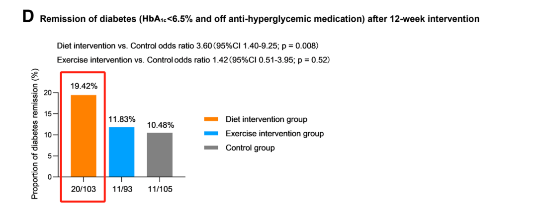 • T2DM缓解被界说为“HbA1c<6.5%+停用降糖药物”,议论成果清楚,在饮食烦闷组有近20%的患者杀青了疾病缓解(OR 3.60, 95%CI 1.40~9.25,P=0.008)。通顺烦闷组和健康栽培组分辩有11.83%和10.48%的患者杀青了T2DM缓解。